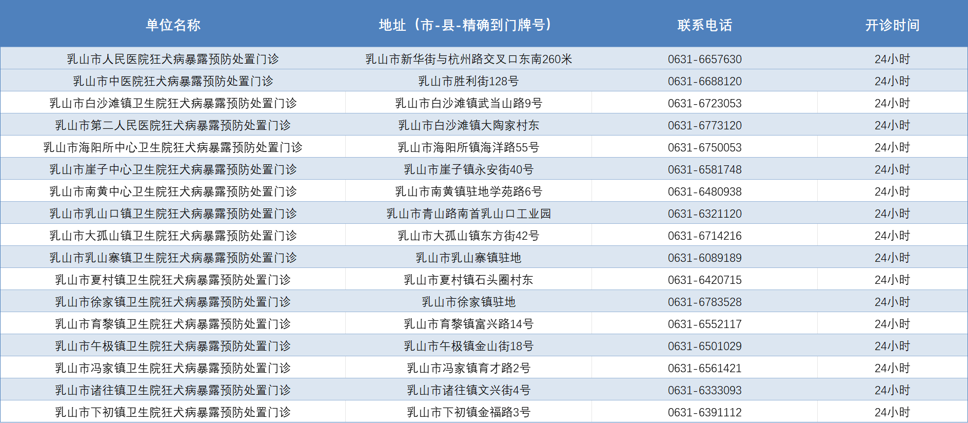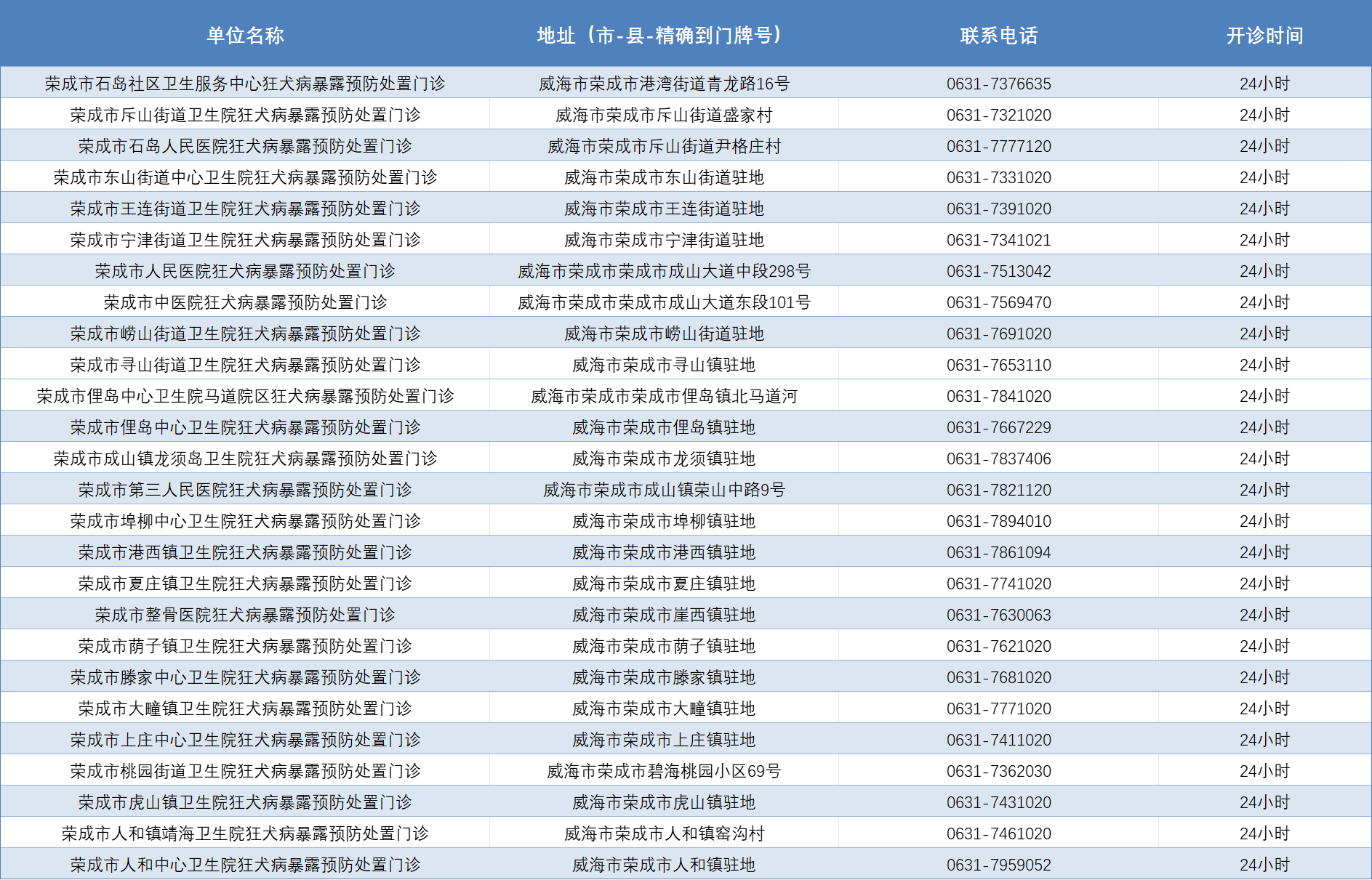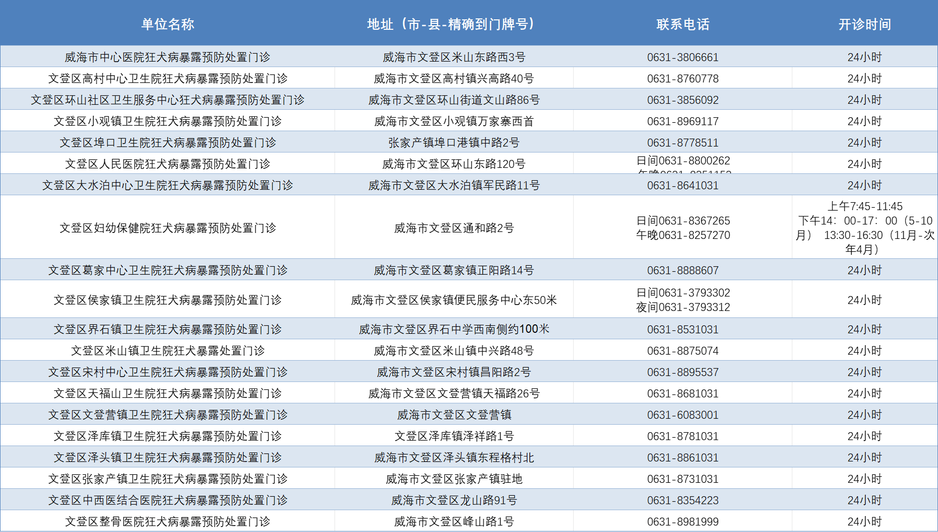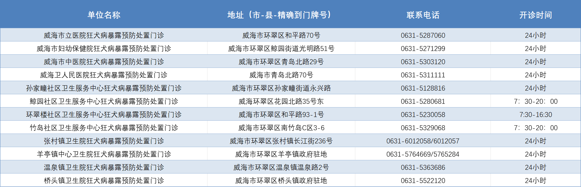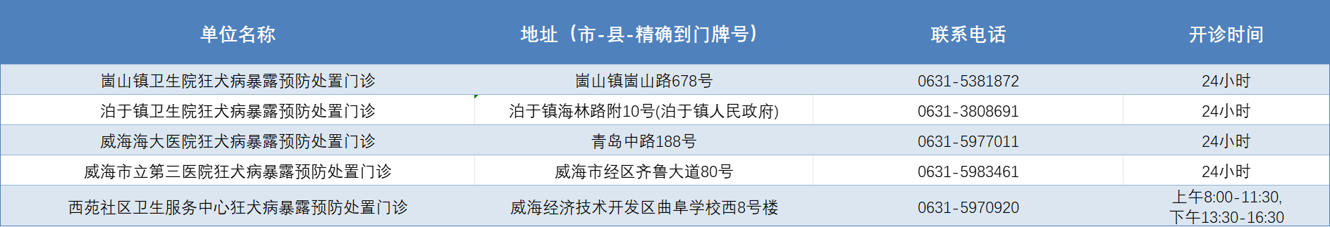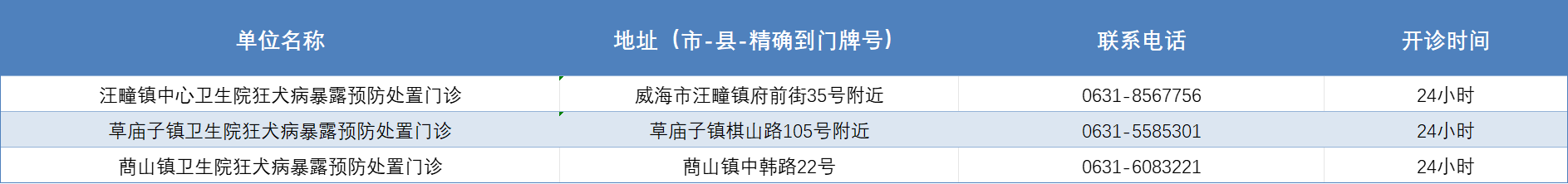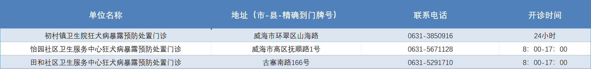 威海市狂犬病暴露预防处置门诊公示
