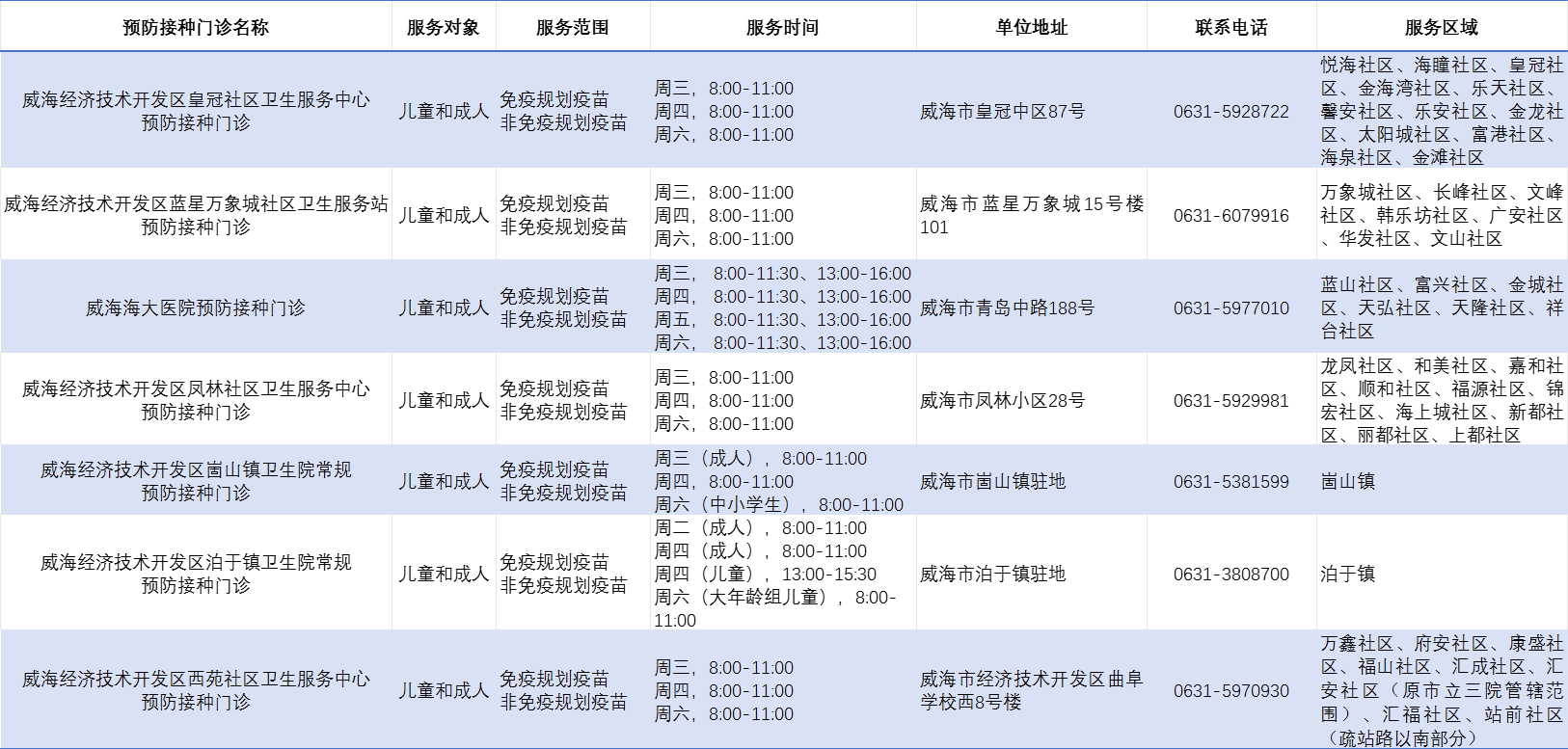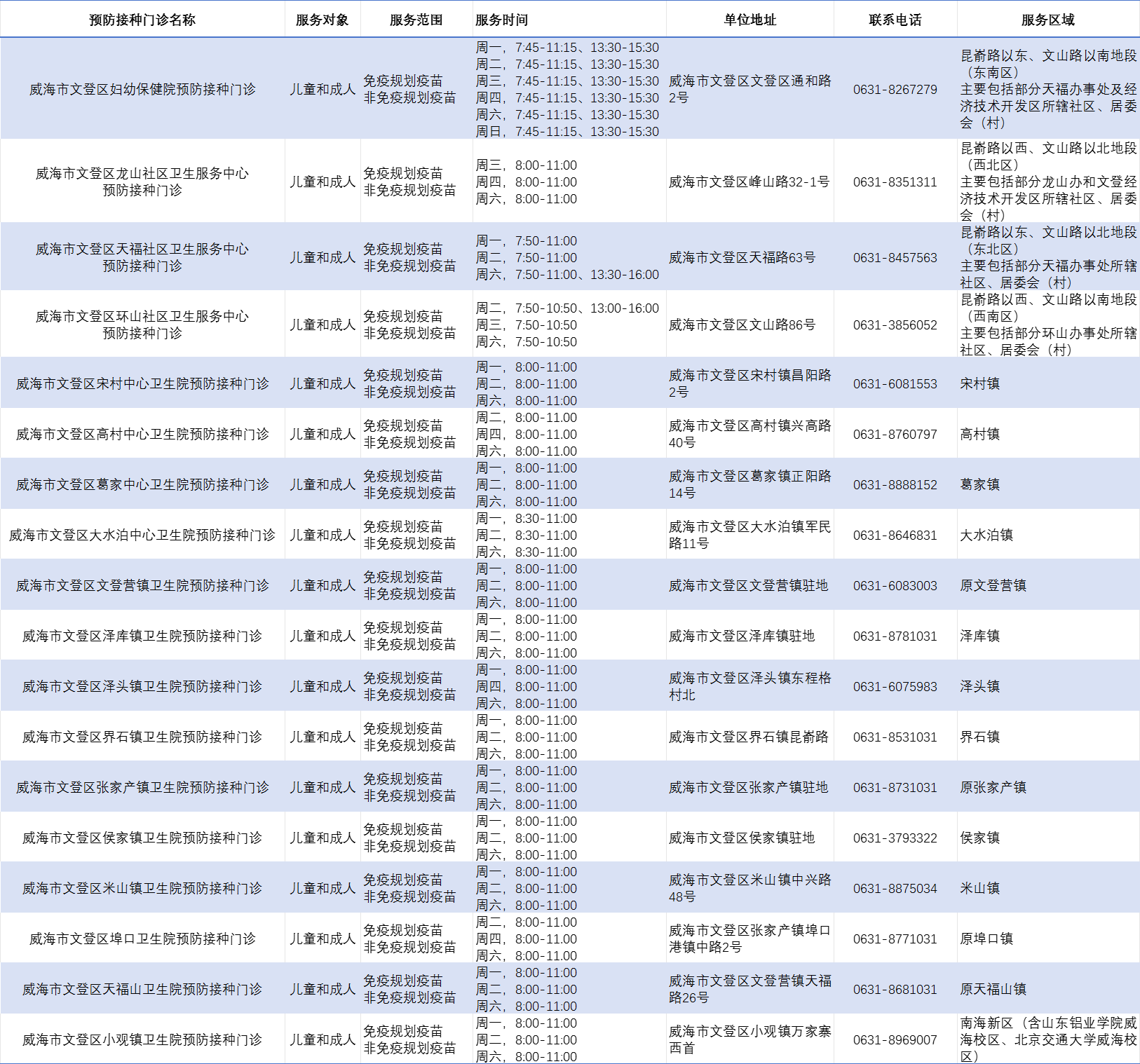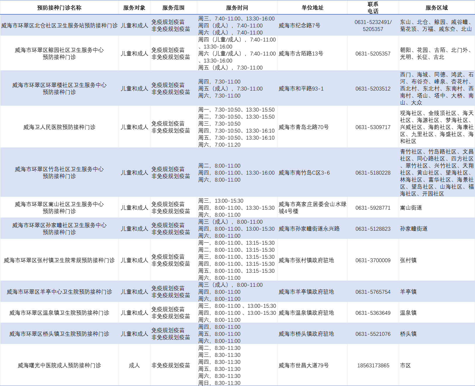 威海市预防接种门诊信息公示如下,如需咨询疫苗相关问题,请致电辖区疾控或辖区预防接种门诊。(注:开诊时间不含国家法定节假日。国家法定节假日具体开诊时间安排,另行公示。)