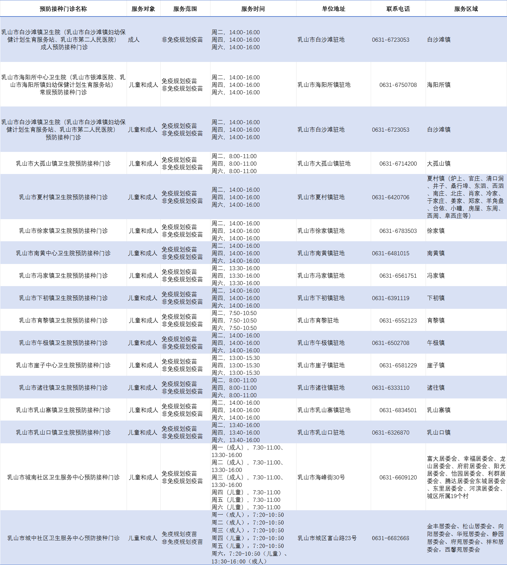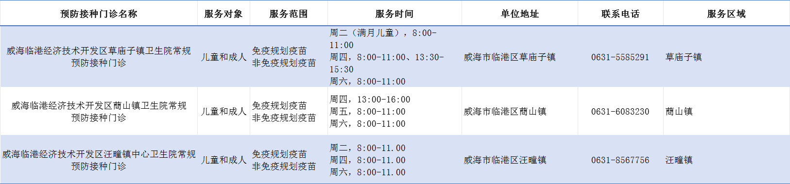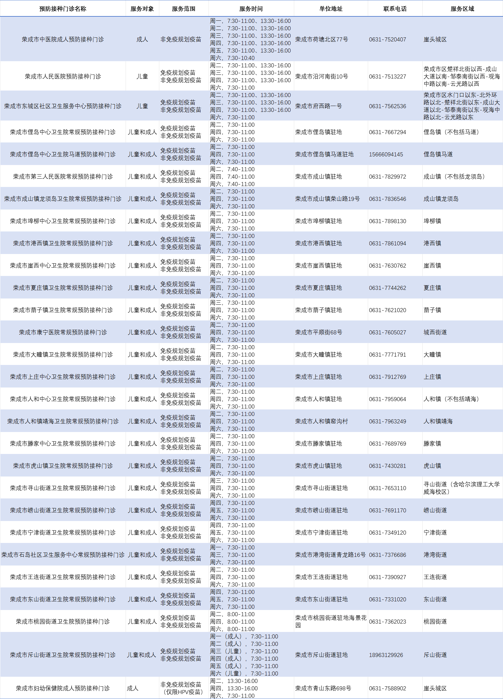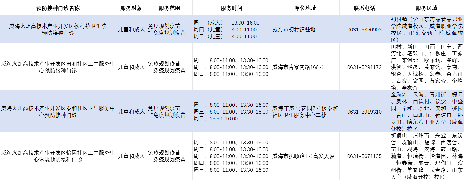 威海市预防接种门诊信息公示如下,如需咨询疫苗相关问题,请致电辖区疾控或辖区预防接种门诊。(注:开诊时间不含国家法定节假日。国家法定节假日具体开诊时间安排,另行公示。)
